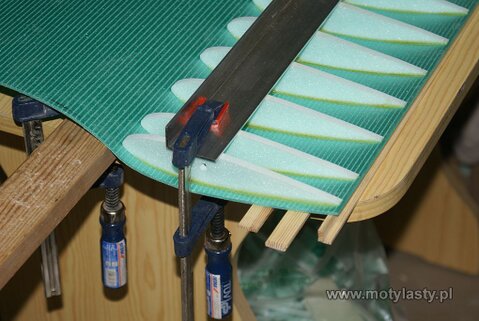 Wręgi główne natomiast zostały zrobione z oklejonego dwustronnie sklejką 0.8mm depronu.