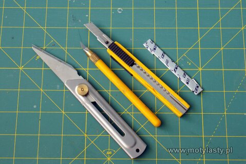 Noże do cięcia, powiem krótko najlepszym jest najdroższy nóż na jaki nas stać. Odradzam używania noży łamanych firm ......... które zakupiliśmy okazyjnie w TESCO za 4 zł. Takie nożyki możemy stosować do ostrzenia ołówków i innych rzeczy, ale nie do cięcia depronu. Ostrze noża musi być sztywne, nie latać na boki w plastikowych oprawach. Co polecam ?. No cóż OLFA mi za reklamę nie płaci,