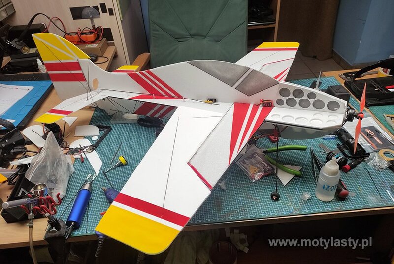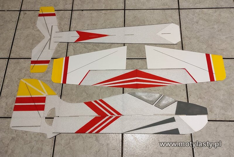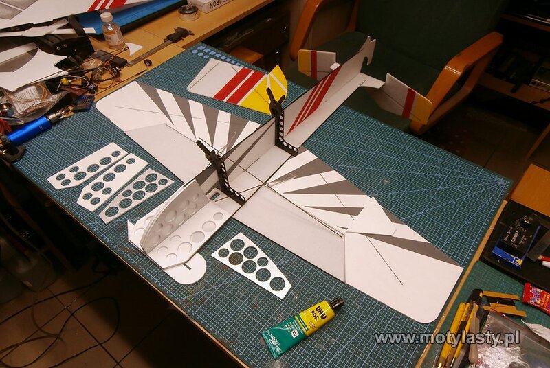 tutaj postawiłem na hybrydę. Depron stanowi poszycie i elementy lżejsze, aby zredukować wagę całkowitą. Pichler wykorzystany na przód modelu oraz lotki. Materiał ten wyróżnia się jednorodną strukturą i dużą elastycznością, co czyni go odpornym na kruszenie i pękanie przy lądowaniach czy manewrach 3D (snapy, harriery).