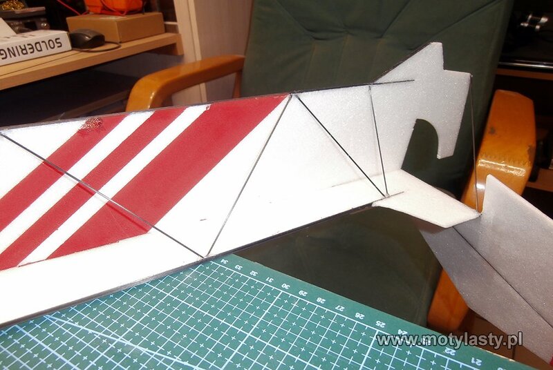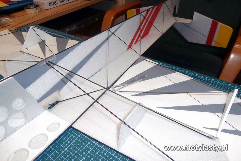 Sercem eksperymentu jest połączenie dwóch różnych materiałów piankowych. Bazę stanowi depron 3 mm, natomiast w miejscach newralgicznych zastosowałem płytę Pichler. Wyciągając wnioski z budowy modelu ToTo-32, gdzie Pichler zapewniał świetną trwałość,